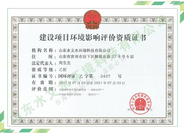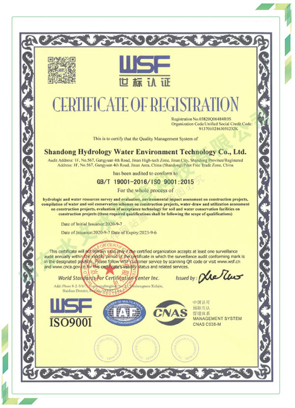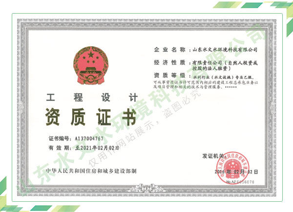 公司擁有水利工程設(shè)計(jì)、水土保持、水文水資源調(diào)查評(píng)價(jià)、水資源論證、建設(shè)項(xiàng)目環(huán)境影響評(píng)價(jià)、市政公用工程施工總承包、水利水電工程施工總承包、電子與智能化工程專業(yè)承包等資質(zhì),2017年通過質(zhì)量管理體系、環(huán)境管理體系、職業(yè)健康安全管理體系認(rèn)證;2020年被評(píng)為國家級(jí)高新技術(shù)企業(yè),同年被中國水利企業(yè)協(xié)會(huì)推薦為第一批“合同節(jié)水服務(wù)企業(yè)”;2021年被山東省、濟(jì)南市評(píng)為 “專精特新”中小企業(yè)。業(yè)務(wù)范圍涉及水利工程設(shè)計(jì);節(jié)水設(shè)計(jì)、改造、水平衡測試;山洪災(zāi)害調(diào)查;城市水資源調(diào)查評(píng)價(jià);建設(shè)項(xiàng)目水土保持方案編制、監(jiān)測、驗(yàn)收、水土保持規(guī)劃;水安全保障規(guī)劃、建設(shè)項(xiàng)目水資源論證、規(guī)劃水資源論證;建設(shè)項(xiàng)目環(huán)境影響評(píng)價(jià);入河排污口論證;防洪影響評(píng)價(jià);市政公用工程施工、水利水電工程施工、電子與智能化工程施工等。